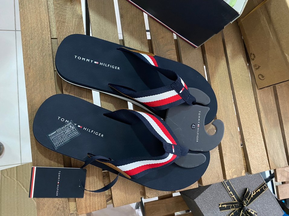 Tommy Hilfiger erkek terlikleri, kırmızı, beyaz ve mavi çizgili baskılı bant ve ayarlanabilir tokaya sahip lacivert renktedir. Kauçuk malzemeden üretilmiştir, rahat ve şık plaj kullanımı sunar.