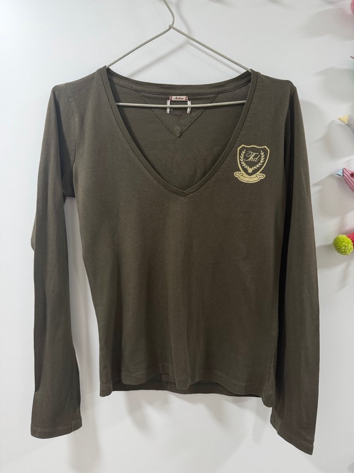 Kadınlar için uzun kollu, V yaka tişört. Koyu yesil/haki renk ve göğüste ve sirtta baskılı arma detayıyla günlük kullanım için uygun, rahat ve şık.