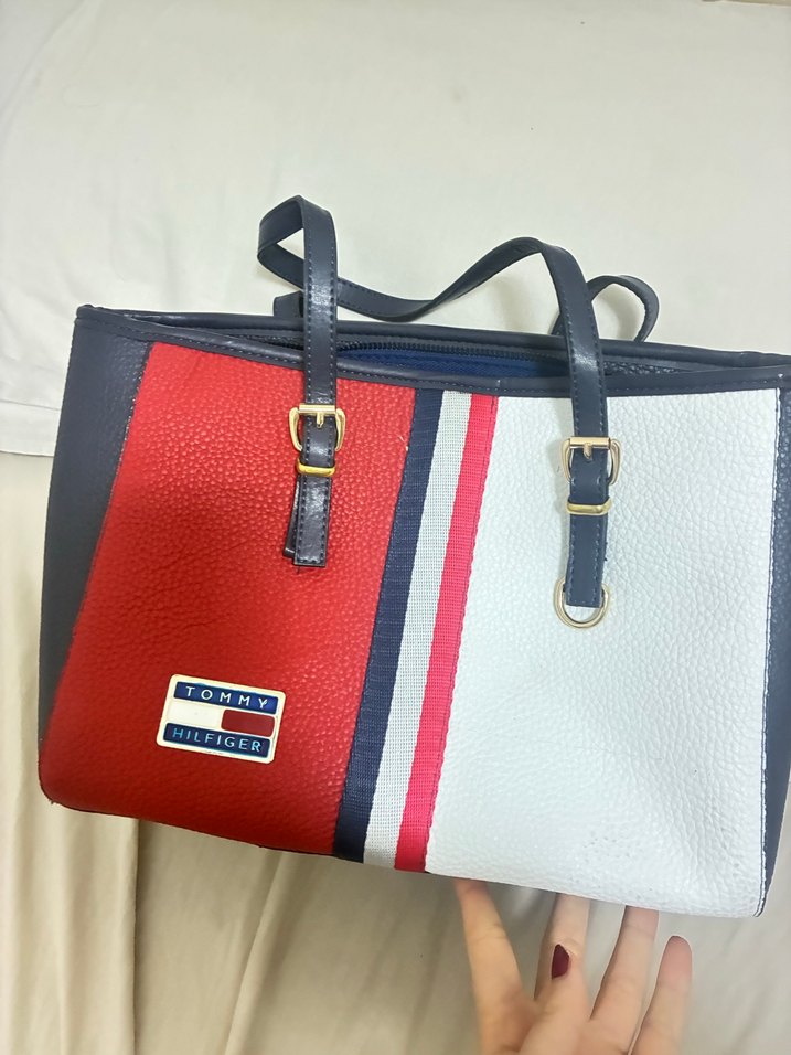 Tommy Hilfiger kadın deri omuz çantası, parlak çok renkli baskılı tasarımı ve tokalı askılarıyla trend sokak modasına uygundur.