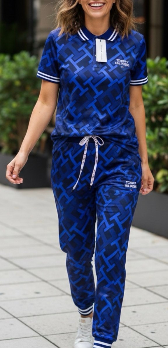 Renkli mavi tie-dye desenli ve kısa kollu kadın eşofman takımı. Bol kesim ve elastik detaylara sahip, dış mekan kullanımı için uygundur. ♀️