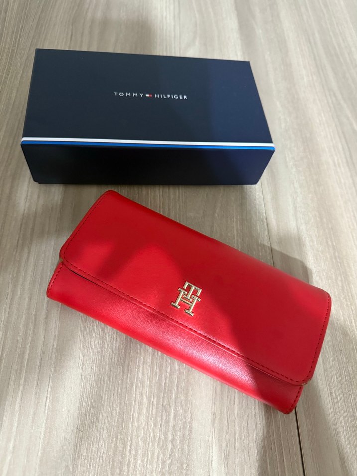 Tommy Hilfiger imzalı, parlak kırmızı deri, baskılı desenli kadın cüzdanı. Modern klasik tarzı ve iş şıklığını günlük kullanıma sunar.