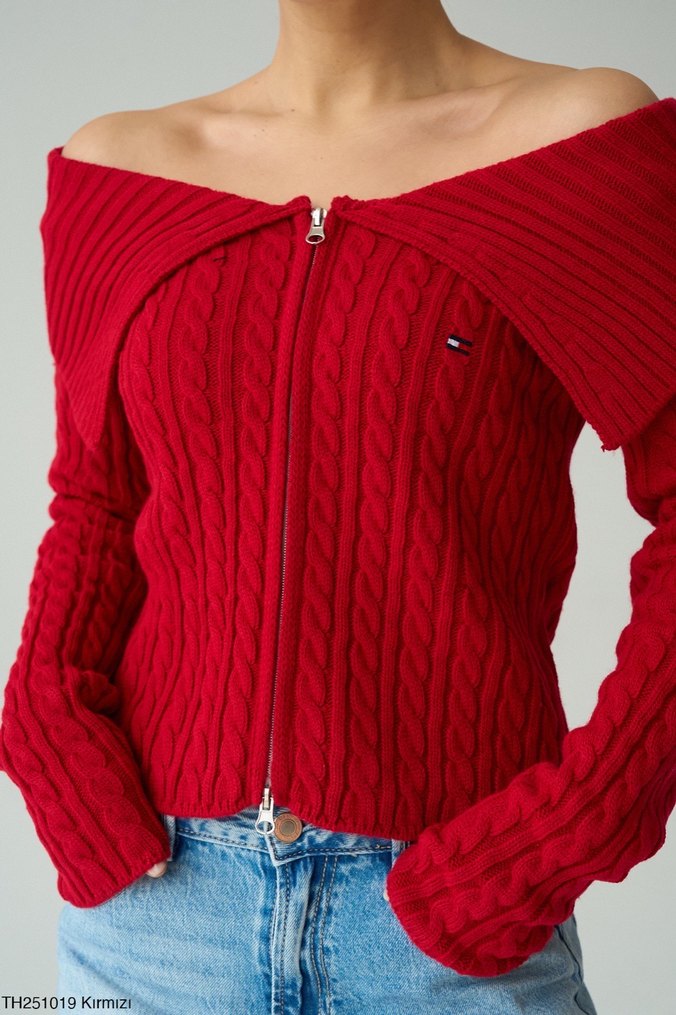 Kadınlar için örgü dokulu, fitted kesim ve uzun kollu kırmızı kazak. Yüksek yaka, önden fermuarlı ve omuzlar açık kullanılabilir. Günlük ve sokak stili için uygundur.