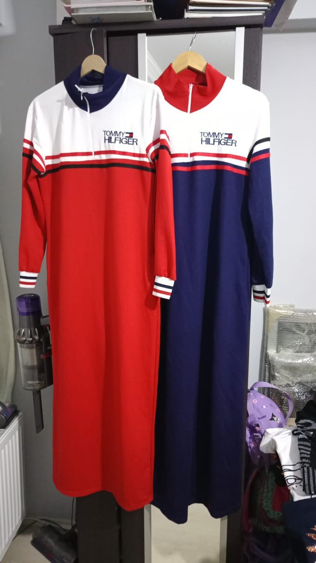 Tommy Hilfiger markalı, uzun kollu, renkli baskılı, regular fit sokak stili uzun elbiselerdir. Kırmızı ve lacivert renk seçenekleri vardır.