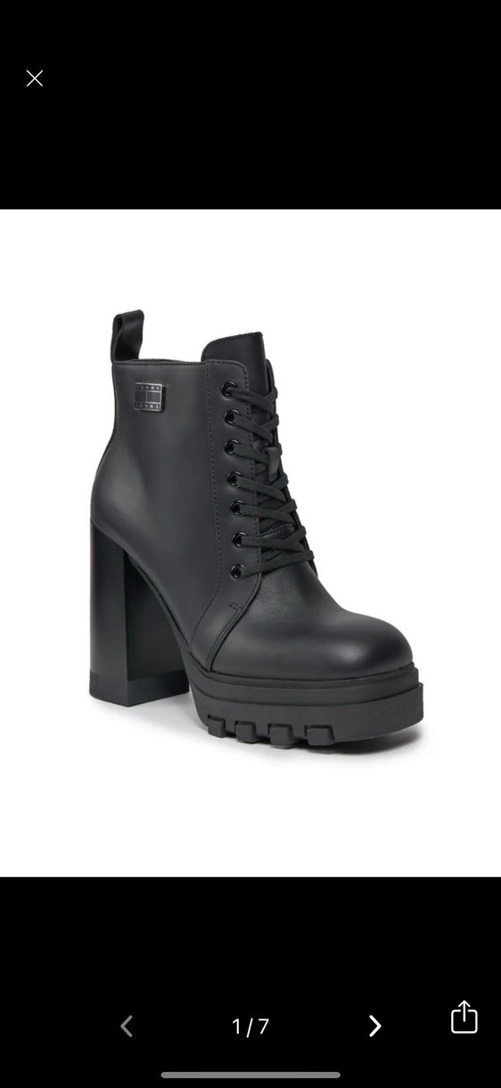 Sıfır orjinal kutulu etiketli ürün Siyah deri, bağcıklı ve kemerli kadın botu. Kalın topuklu ve gotik tarzıyla ofis kullanımı için uygun.