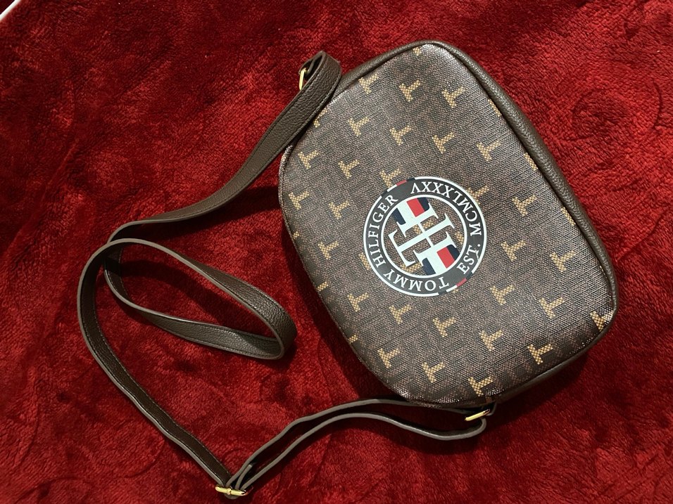 Tommy Hilfiger marka, baskılı desenli, tokalı kayışlı koyu kahverengi deri çapraz çanta, trend sokak stiline uygun. Ayrıca göründüğünden büyük çok kullanışlı bir çanta