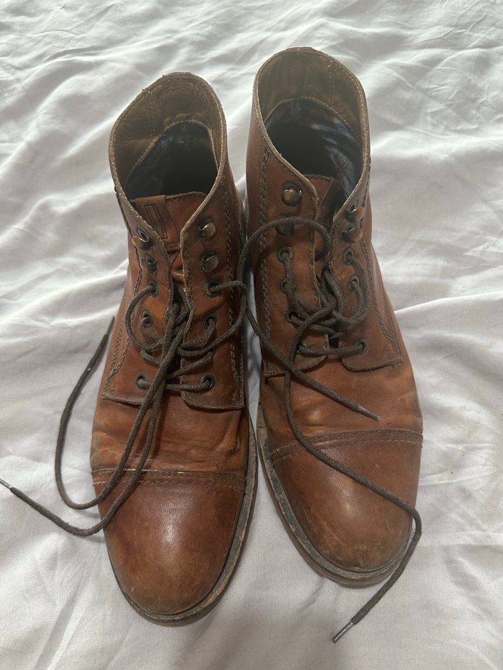 Kahverengi deri erkek botları, parlak yüzeyli ve tokalıdır. Vintage, karşı kültür tarzında, günlük kullanıma uygundur. Hiç boyanmadı. Eskitme tarzda kaliteli deri