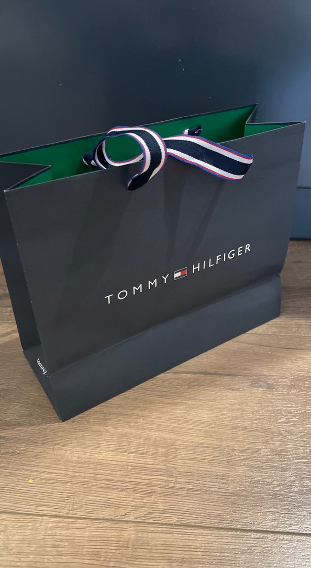 Koyu siyah renkli, baskılı Tommy Hilfiger markalı karton çanta. Çizgili saplarıyla şık ve kullanışlıdır. 21x25 cm ölçüsündedir. Geri iade alınmayacaktır.