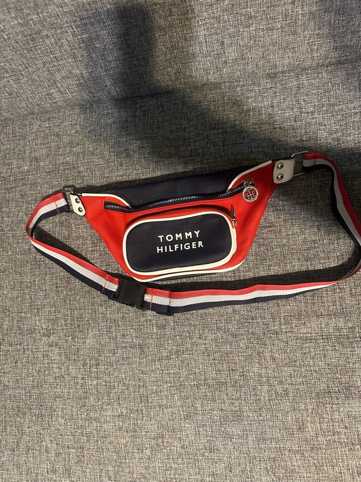Tommy Hilfiger marka, kırmızı bel çantası. Baskılı logo ve ayarlanabilir gri-kırmızı kayışlı, sokak ve spor tarzına uygun.