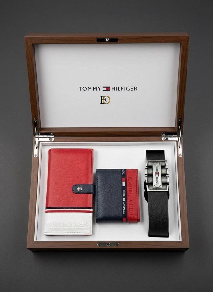 Tommy Hilfiger markalı, kırmızı desenli cüzdan ve koyu renk kemerden oluşan, modern ve şık çocuk seti.