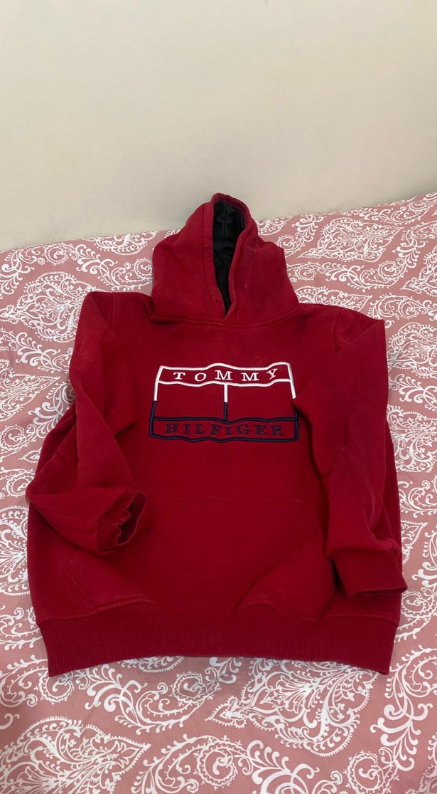Tommy Hilfiger markalı, koyu kırmızı kapüşonlu erkek sweatshirt. Uzun kollu, bol kesim ve yumuşak, sıcak kumaştan üretilmiştir. Önünde marka logosu ve fermuarlı detay bulunur.