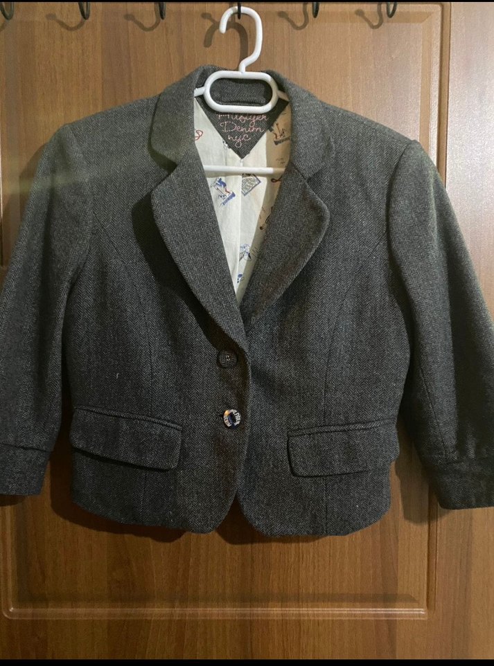 Orijinaldir. Düğmeli önü ve keskin yakası olan, yumuşak kot gibi olan kumaştan yapılmış gri kısa kadın blazer ceket. kapri kollu ve regular fit, iş ve günlük tarz için uygundur.