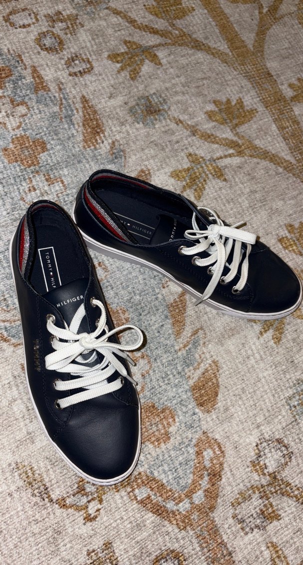 Tommy Hilfiger markalı lacivert bağcıklı spor ayakkabılar, dolgu topuk ve beyaz bağcık detayları ile günlük kullanım için uygundur. Arka mavi beyaz gri simli yer lastiktir çok rahatt