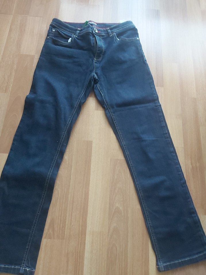 Tommy Hilfiger marka, düğmeli, baskılı lacivert erkek çocuk kot pantolon. Günlük kullanıma uygun, fitted kesim, (16) beden.