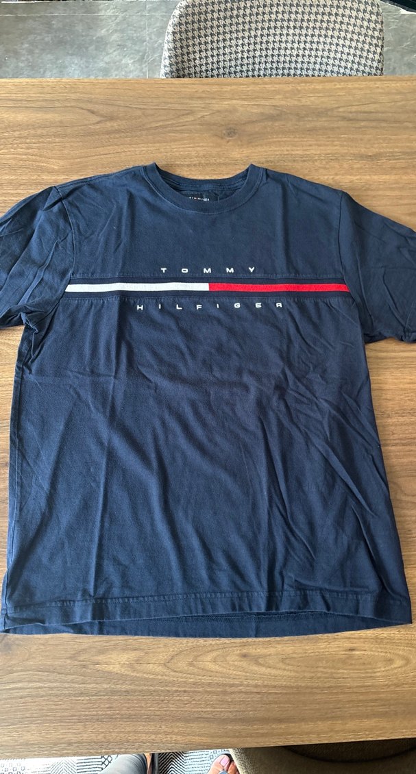 Tommy Hilfiger marka, lacivert renkte, kısa kollu, bisiklet yakalı, baskılı ve bol kesim erkek tişörtü. Günlük kullanıma uygun rahat bir parça.