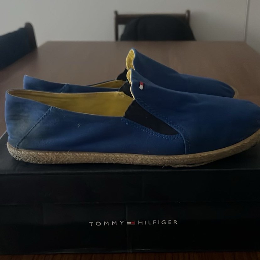 Tommy Hilfiger lacivert kadın espadril, stiletto topuk ve cırt cırtlı kapanışa sahip. Dayanıklı kauçuk tabanlı, günlük sokak stili için uygun, minimal desensiz tasarım.