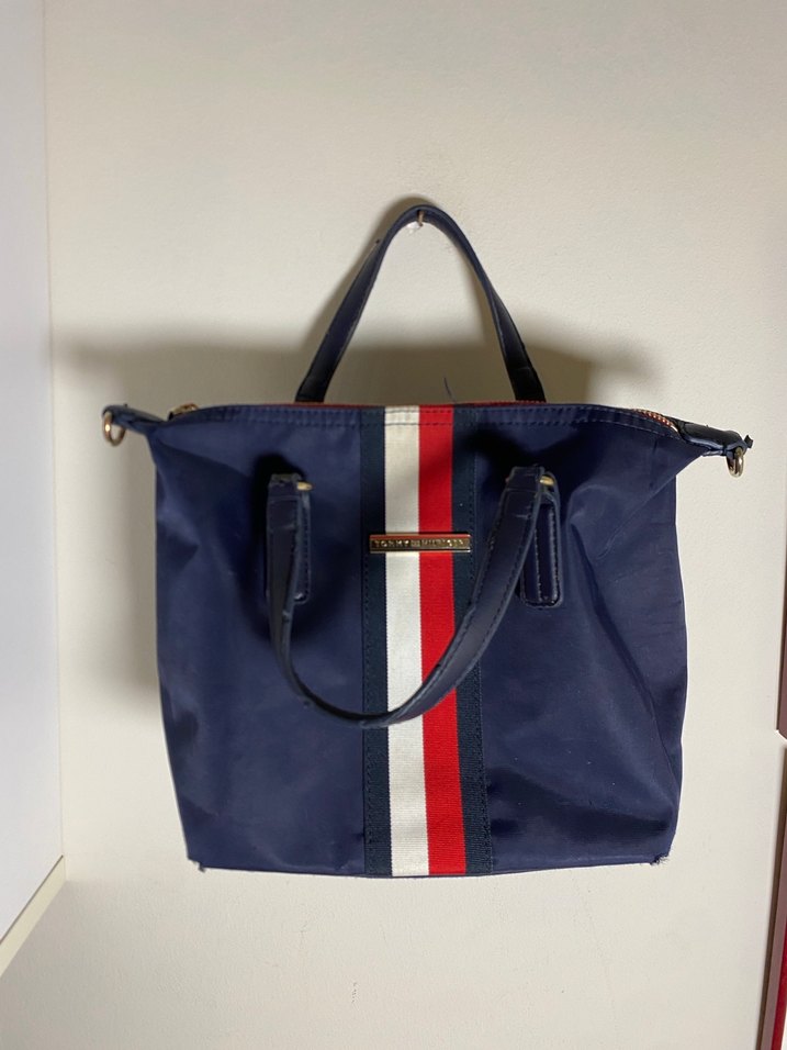 Lacivert renkli, şık Tommy Hilfiger kol çantası. Sap kısımlarında hafif aşınmalar vardır o yüzden fiyatı uygun tuttum kullanıma engel değil✨