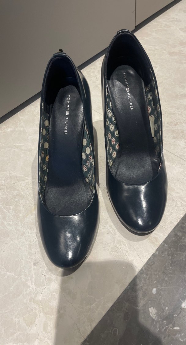 Tommy Hilfiger markalı, parlak lacivert renkte, kauçuk tabanlı platform topuklu kadın ayakkabısı. Ofis için uygun, gotik ve trend şıklık sunar.