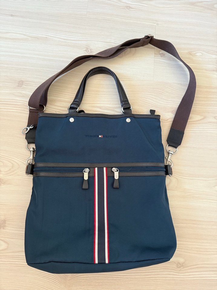 Tommy Hilfiger lacivert renkli, fermuarlı bölmeleri ve baskılı deseniyle spor tarzına uygun, çıkarılabilir askılı kadın çantası. Sıfır ayarında Orijinal #tommyhilfiger #tommy