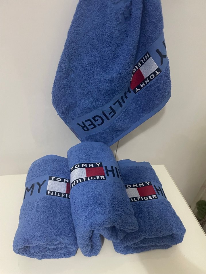Tommy Hilfiger markalı, baskılı logo detaylı, yumuşak ve emici kumaştan mavi havlu 50 x 94 cm ölçülerde sıfır Paketli