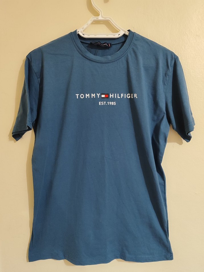 Tommy Hilfiger markalı mavi (koyu mavi laciverte yakın) erkek tişört, yuvarlak yaka ve kısa kollu, normal kesim. Önünde baskılı logo ve "EST.1985" yazısı bulunur. Günlük kullanım için %100 pamuk kumaştan üretilmiştir.