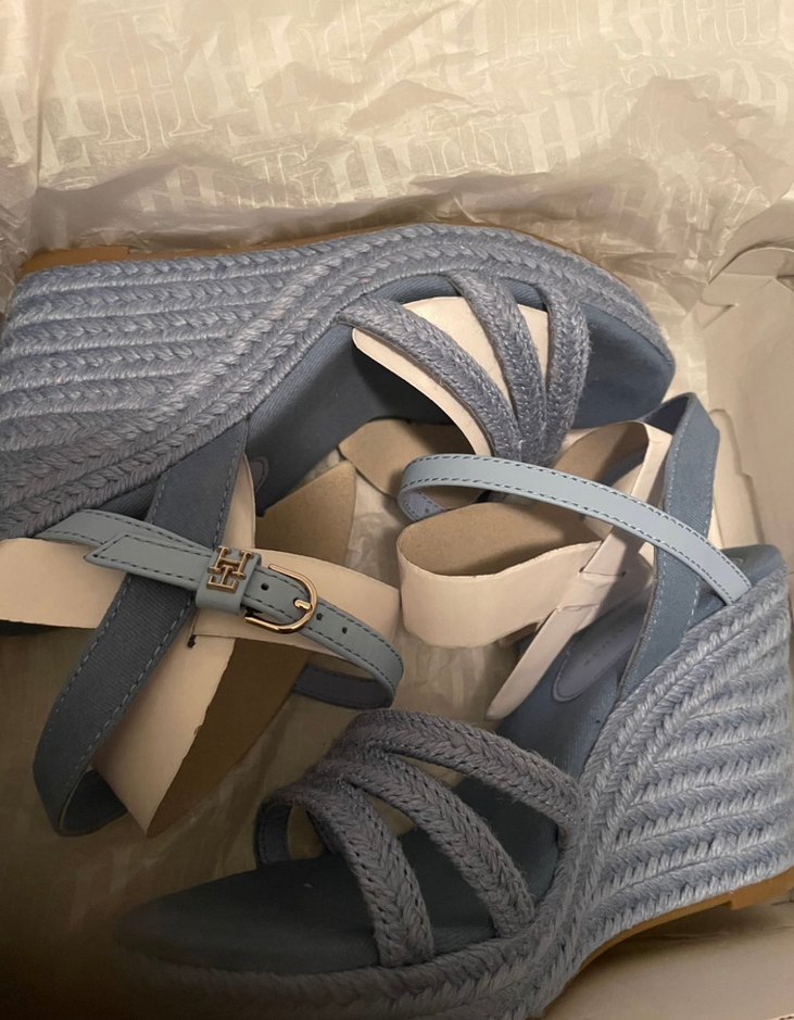 Mavi tokalı bantlara ve kauçuk tabana sahip dolgu topuklu sandaletler, rahat bohem tarzıyla açık hava kullanımı için uygundur. Tommy hilfiger markadır hiç kullanılmadı etiketi üstünde