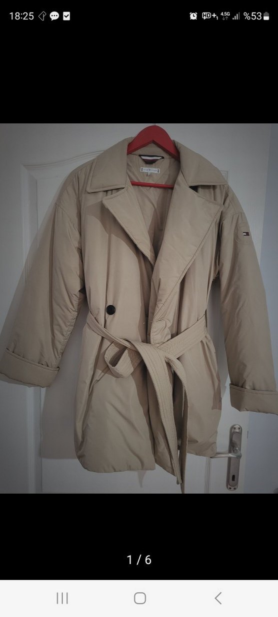 Bej renkli, kemerli ve normal boy midi trençkot. Notlu yaka ve rahat kesimiyle günlük şık sokak stiline uygun.l beden