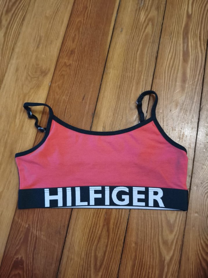 Ayarlanabilir askılı, baskılı logo bantlı pembe Tommy Hilfiger çocuk braleti. DEFOLU ufak bir delik var resimlere bakınız