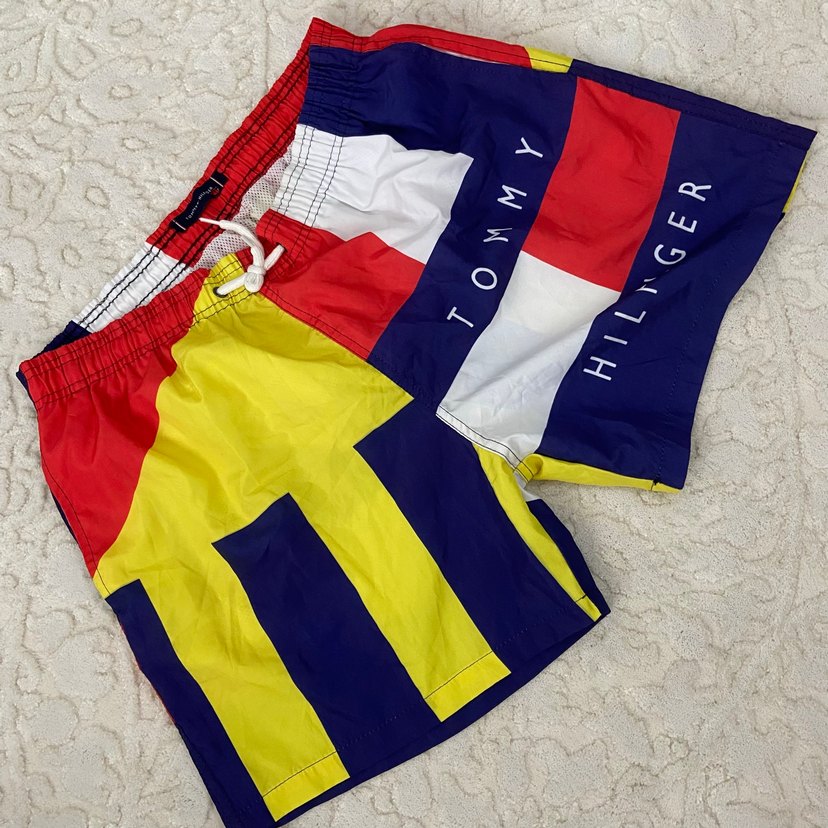 Renkli Tommy Hilfiger mini şort, bol kesim ve cırt cırt detaylı, plaj için uygun tie-dye tarzında.
