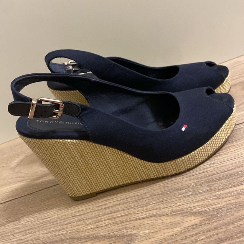 Parlak desenli mavi dolgu topuklu, tokalı bantlı ve kauçuk tabanlı kadın ayakkabısı. Günlük kullanıma uygun çağdaş tasarım.
