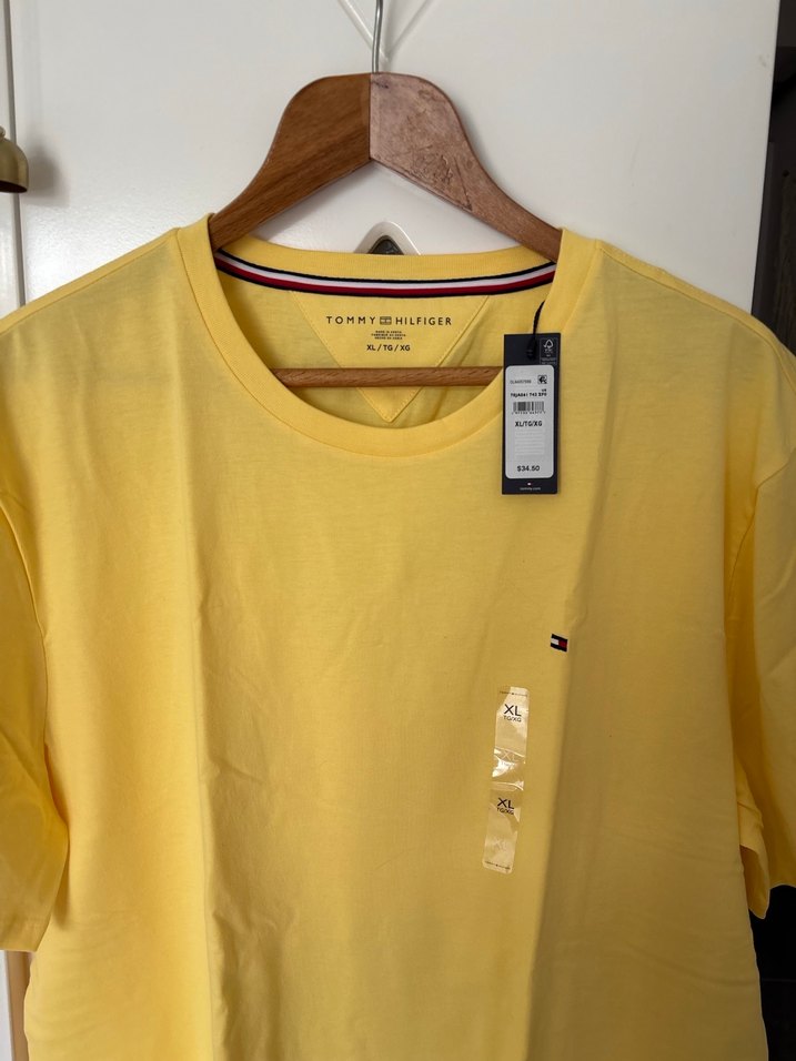 Tommy Hilfiger erkek tişörtü, açık sarı renkte, yuvarlak yaka ve kısa kolludur. Pamuklu kumaştan yapılmış, bol kesimdir. Günlük kullanıma uygun, rahat ve şık bir tasarımdır. Kol altı 60 cm