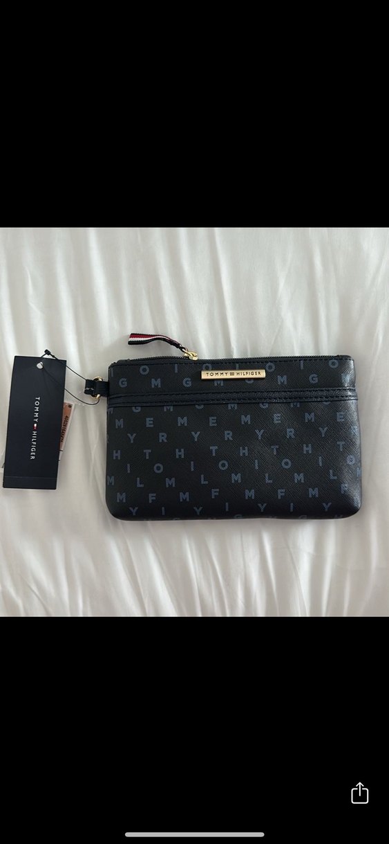 Tommy Hilfiger marka siyah deri cüzdan, baskılı desenli ve fermuarlı, günlük kullanım için uygun, trend sokak stiline uyumlu.