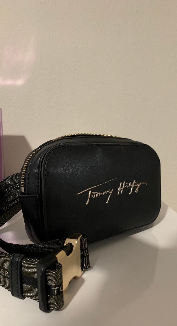 Siyah deri çapraz, bel çantası parlak yüzeyli ve baskılı kemer kayışlıdır. Önünde Tommy Hilfiger imzası bulunur, trend sokak stiline uygundur.