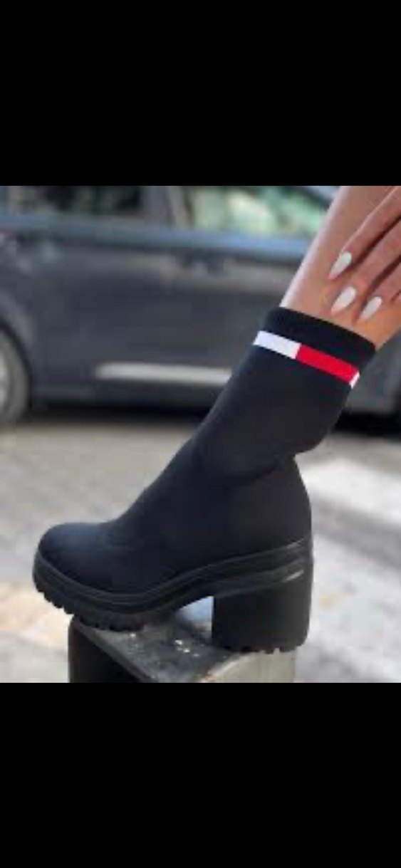 Siyah elastik üst kısmı ve blok topuklu, kauçuk malzemeden yapılmış kadın botu. Günlük rahat sokak stili için uygundur.