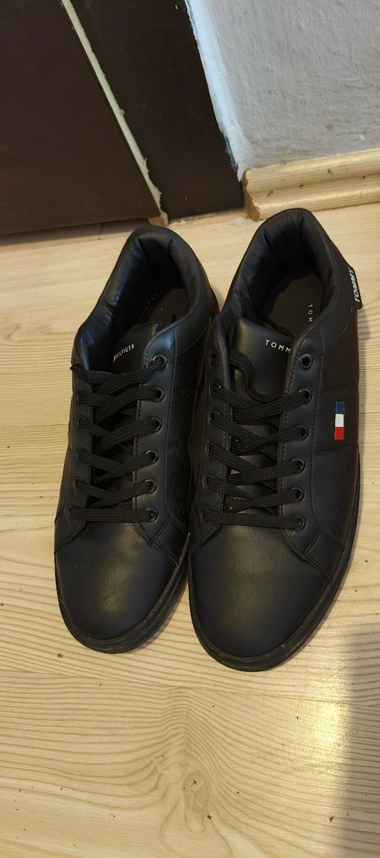 Tommy Hilfiger markalı siyah erkek spor ayakkabısı, bağcıklı ve kauçuk tabanlıdır. Sokak stiline uygun iki kere giyildiği