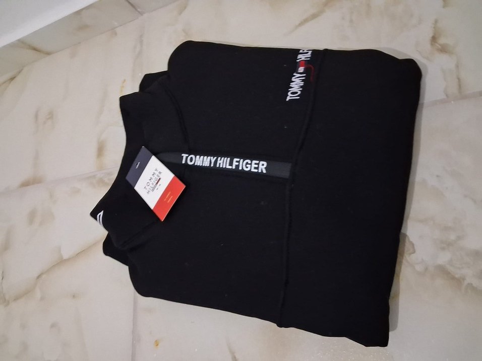 Tommy Hilfiger markalı siyah sweatshirt, uzun kollu ve bisiklet yaka. Fermuarlı detay ve baskılı logo bulunur, yumuşak ve sıcak kumaştan yapılmıştır.
