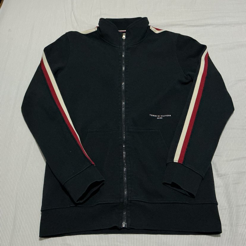 Tommy Hilfiger marka, lacivert renkli, uzun kollu, yüksek yakalı ve fermuarlı, kol şerit detaylı, günlük kullanıma uygun erkekler de kızlar da tercih edebilir