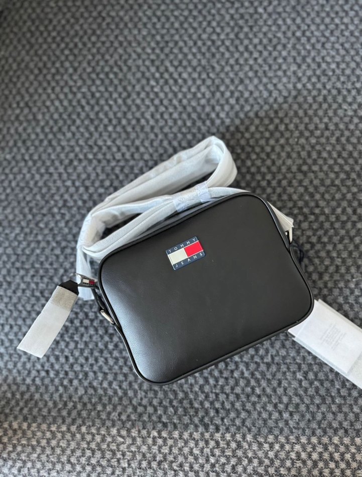 Tommy Hilfiger marka, siyah deri bel detaylı çapraz çanta. Günlük sokak stili için uygun, desensiz ve önünde marka logosu bulunur.
