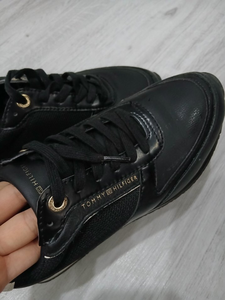 Tommy Hilfiger siyah kadın spor ayakkabılar, dolgu topuklu ve bağcıklı tasarıma sahip, günlük sokak stili için kauçuk tabanlıdır.