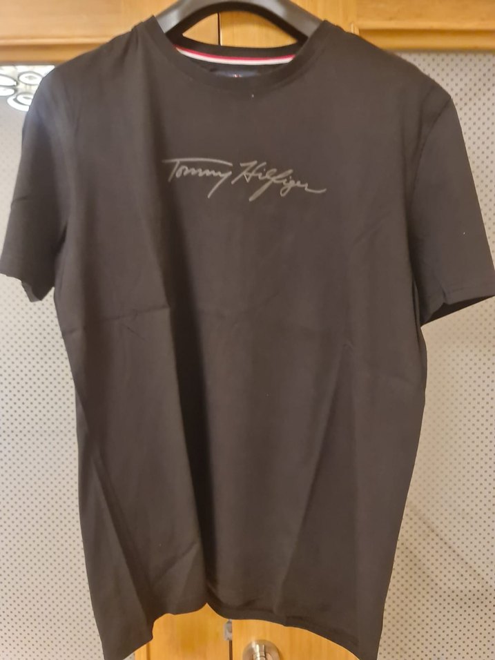 Tommy Hilfiger,XXL beden,siyah tişört, kısa kollu ve yuvarlak yakalıdır.