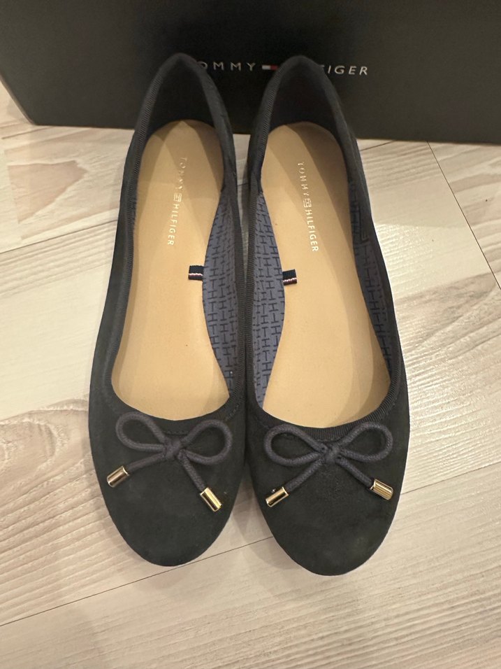Tommy Hilfiger siyah süet kadın babetler, dolgu topuklu ve küçük fiyonk detaylı, klasik ve çağdaş şıklık sunar. Dışarıda hiç giyilmedi.