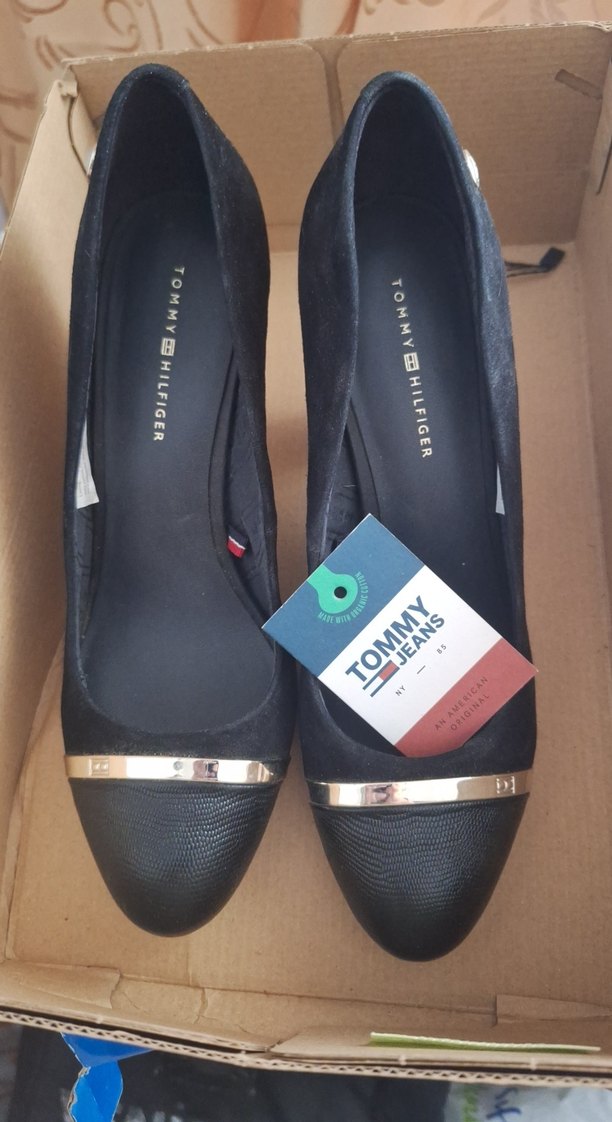 Tommy Hilfiger siyah tokalı stiletto, baskılı dokusu ve kauçuk malzemesi ile ofis ve sokak tarzına uygun rahat bir modeldir.
