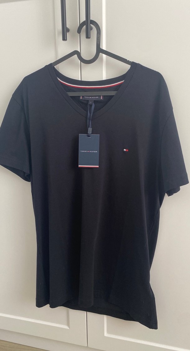 Tommy Hilfiger markalı siyah renkli, V yaka kısa kollu erkek tişört. Pamuk kumaştan, rahat kesim ve baskılı logo detayına sahiptir.