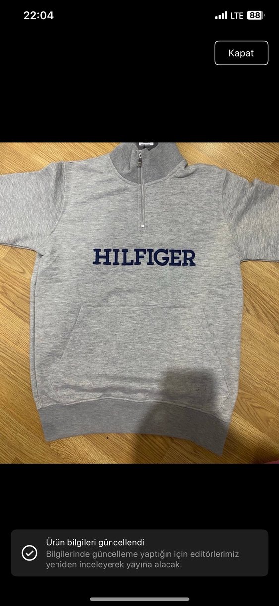 Gri renkte, yarım fermuarlı, yüksek yakalı, uzun kollu ve bol kesim erkek sweatshirt. Göğüste "HILFIGER" baskısı bulunur. Rahat ve sıcak kumaştan üretilmiştir. S beden ama m bedenede olur kalıbı kücük degıl