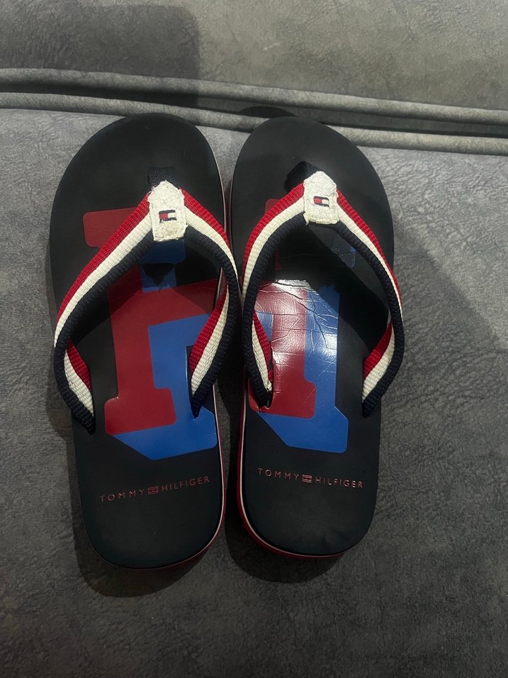 Tommy Hilfiger unisex terlik, çok renkli baskılı ve tokalı bantlıdır. Kauçuk malzemeden yapılmış, plaj ve günlük sokak stili için uygundur.