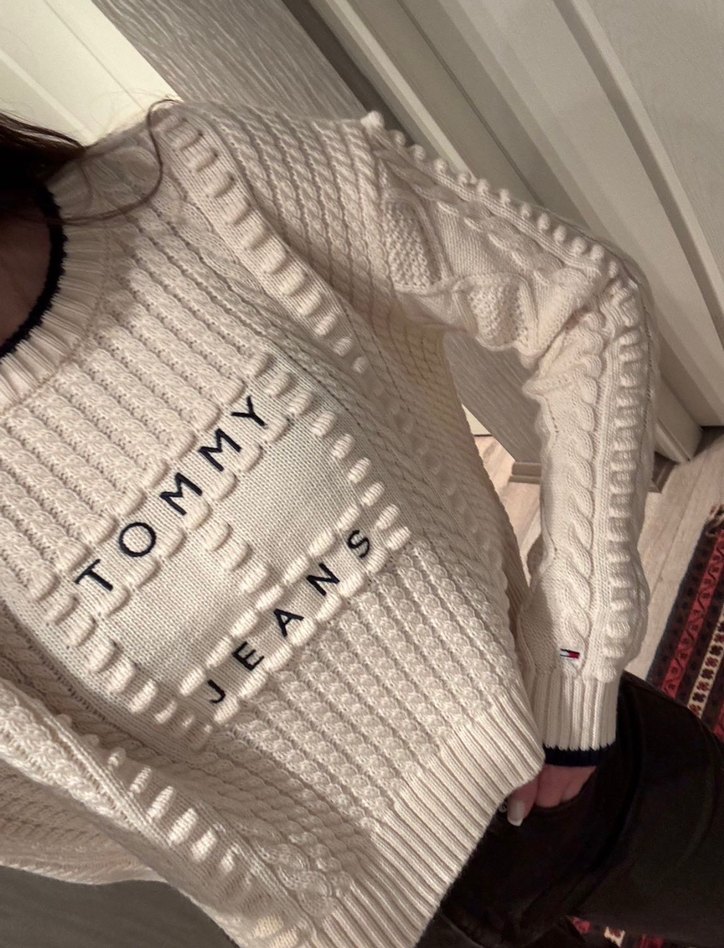 Tommy Jeans baskılı, beyaz örgü, fitted kesim, uzun kollu kadın kazak. Sokak stili için uygun, rahat ve şık bir parça.