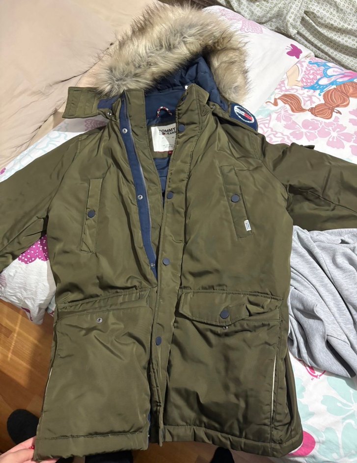 Tommy Jeans markalı, üzerinde 'Tommy Jeans An American Original' yazan khaki erkek montu. Sokak ve günlük tarzlara uygun.