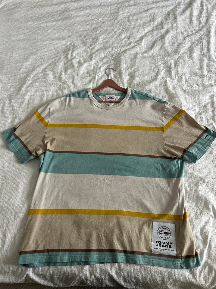 Tommy Jeans erkek tişörtü, rahat kesim, yuvarlak yaka ve kısa kolludur. Bej, mavi ve sarı pastel çizgilerle pamuklu kumaştan üretilmiştir. Günlük kullanım için şık ve rahat.