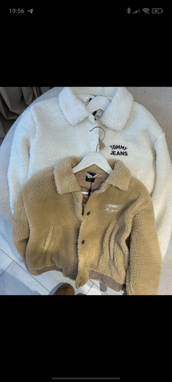 Tommy Jeans marka, kahverengi peluş detaylı, uzun kollu, bol kesim, midi boy kadın ceket. Yuvarlak yaka ve baskılı logo bulunur.