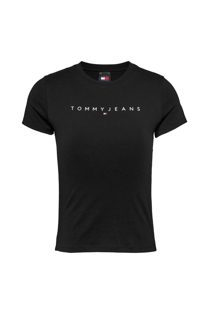 Tommy Jeans marka, pamuklu, siyah, baskılı, kısa kollu ve fitted kesim kız tişörtü. Crew neck yakaya sahip, rahat ve şık bir sokak stili ürünü.