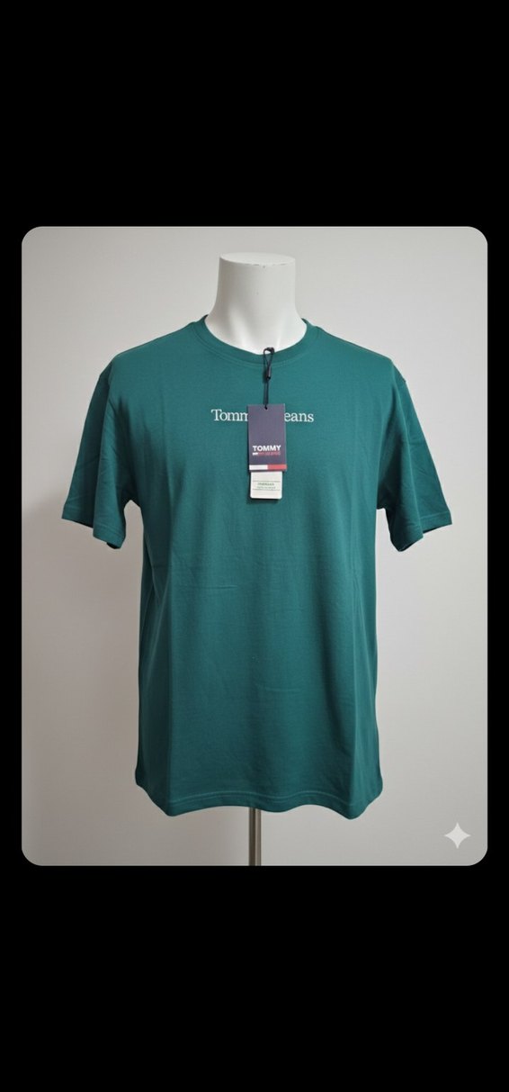 Tommy Jeans marka, koyu yeşil renk, kısa kollu, yuvarlak yaka, bol kesim erkek tişört. Göğüs kısmında baskılı logo bulunur, yumuşak ve sıcak kumaştan üretilmiştir.